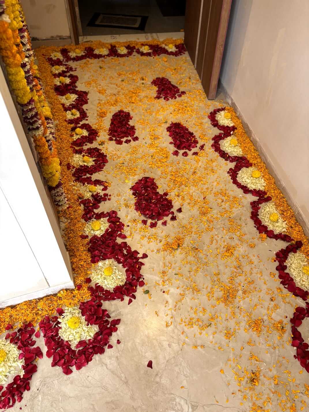 Celebrate the arrival of your little bundle of joy with this stunning Baby Welcome Rangoli, designed to create a heartwarming and memorable entrance. Crafted with fresh rose petals and vibrant marigold flowers, this elegant floor décor adds a touch of love, positivity, and celebration to your home.