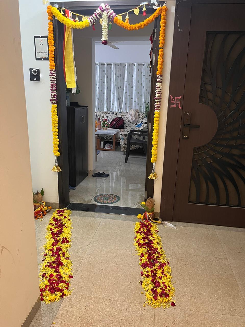 Enhance your home’s entrance with this beautifully crafted Door Toran, designed to bring positivity, prosperity, and festive charm to your space. Adorned with vibrant marigold-style flowers and elegant hanging accents, this toran instantly creates a warm and welcoming atmosphere.